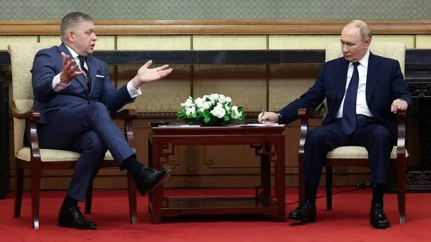 El primer ministro eslovaco, Robert Fico, y el presidente ruso, Vladímir Putin, se reunieron en la residencia estatal Diaoyutai de Pekín, China, el 2 de septiembre de 2025. Foto: IMAGO / SNA