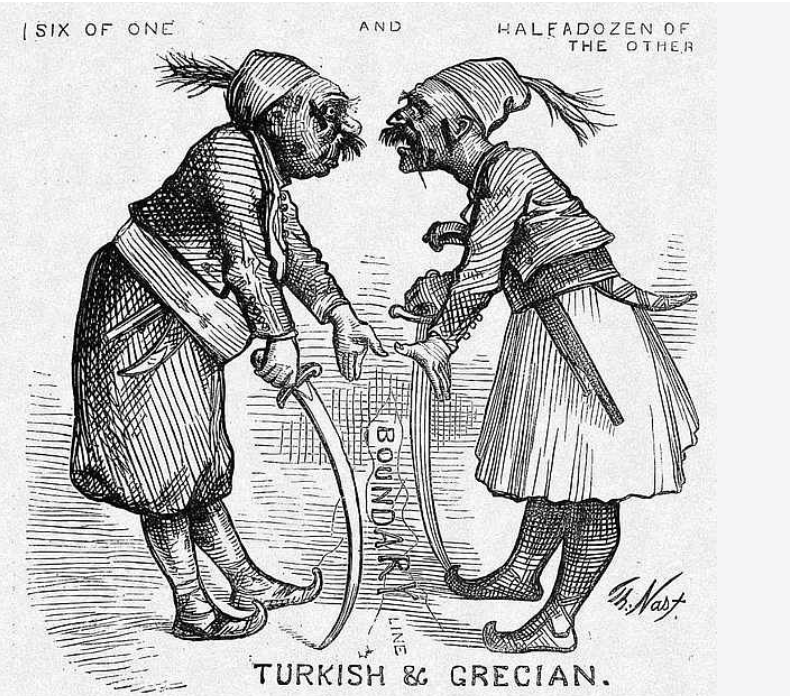 Caricatura de 1881 que representa a un turco y un griego discutiendo sobre una frontera.