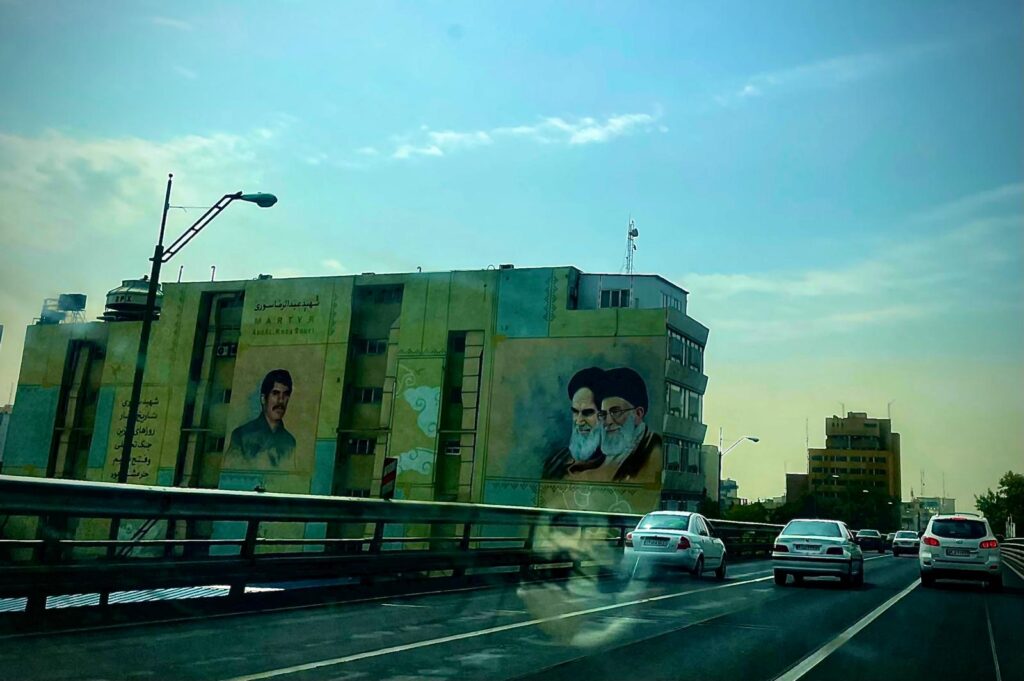 Teherán, agosto de 2021: Retratos del imán Jomeini y del ayatolá Jamenei dominan un gran mural en un edificio con vistas a una importante autopista, ejemplificando la omnipresente presencia visual del liderazgo revolucionario iraní en las calles de la capital. Crédito de la foto: The Amargi