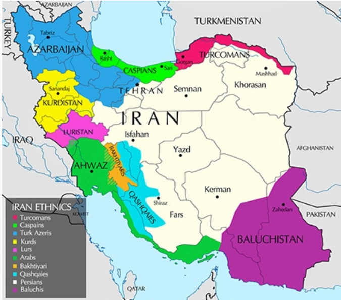 Mapa de la diversidad étnica de Irán que muestra los principales grupos. Crédito: Grupos étnicos en Irán, por Mapper 01, Wikimedia Commons, CC BY-SA 4.0.