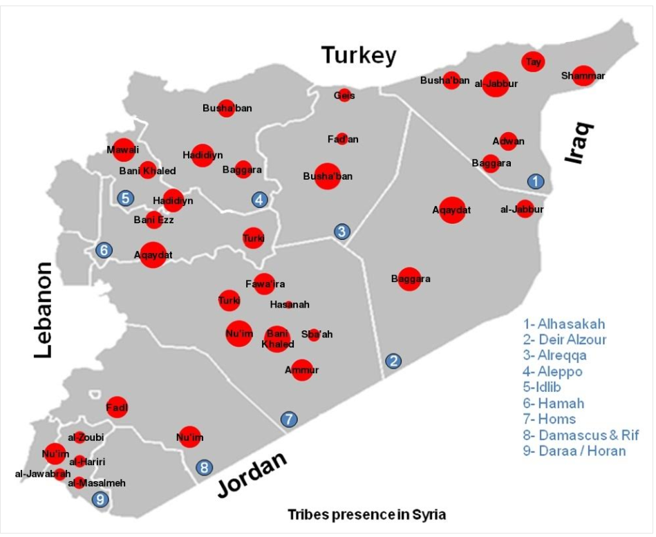 La autoridad tribal está más arraigada en la cuenca del Éufrates (Deir ez-Zor y Raqqa), las zonas de mayoría árabe de Hasakah, la Badía siria, la zona rural de Daraa y los cinturones beduinos alrededor de Suwayda. Estas regiones comparten una presencia estatal limitada, tribunales ineficaces, infraestructuras deficientes y una situación de seguridad inestable, condiciones que llevan a las comunidades a recurrir a los líderes tribales para resolver las disputas.
