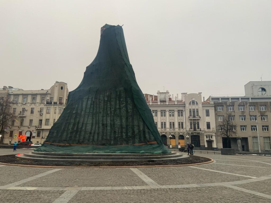 Monumento a Taras Shevchenko en Járkov. El monumento está cubierto por una estructura protectora, 2023. Foto Mykola Homanyuk