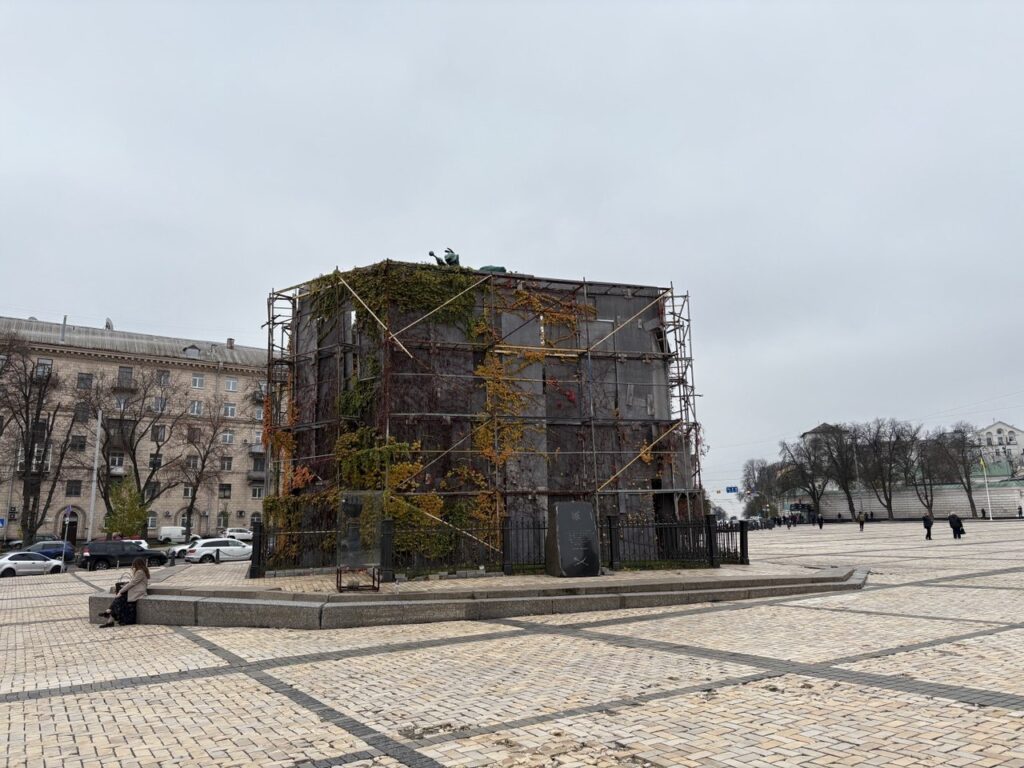 Monumento a Bohdan Khmelnytsky en Kyiv. El monumento está cubierto por una estructura protectora, 2025. Foto Mykola Homanyuk