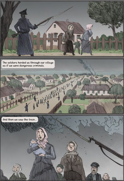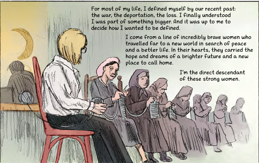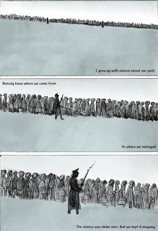 La novela gráfica permite transmitir visualmente emociones, expresiones faciales, atmósfera y simbolismo. El color juega un papel importante. Por ejemplo, en la mitad del libro hay unas veinte páginas que representan las deportaciones: los viajes en tren y la llegada a Kazajistán, donde mujeres y niños fueron abandonados a temperaturas de -30 °C. Estas páginas tienen bordes grises que reflejan la desolación de esa época.