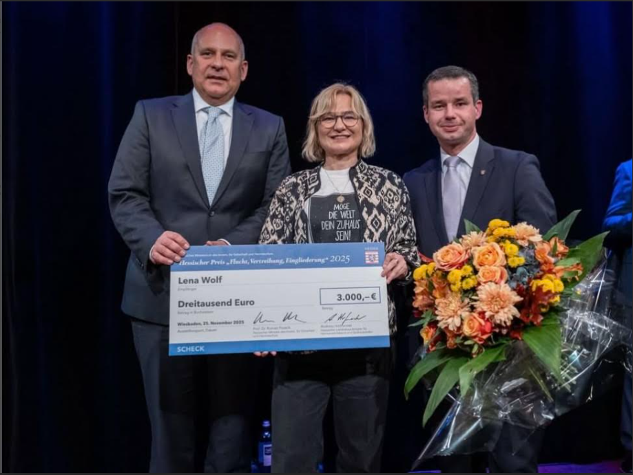 Lena Wolf recibiendo el premio Evasión, Desplazamiento e Integración 2025 de manos del ministro del Interior de Hesse, el prof. Dr. Roman Poseck, y de Andreas Hofmeister, comisario de Hesse para Desplazados y Repatriados en Alemania.
