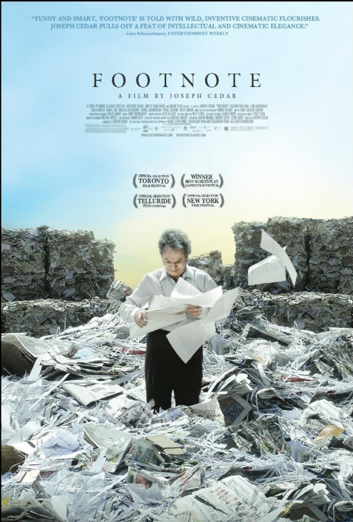 Footnote (2011) de Joseph Cedar. Eliezer y Uriel Shkolnik son padre e hijo, además de profesores rivales en Estudios Talmúdicos. Cuando ambos se enteran de que Eliezer será galardonado por su trabajo, su complicada relación alcanza un nuevo punto álgido.